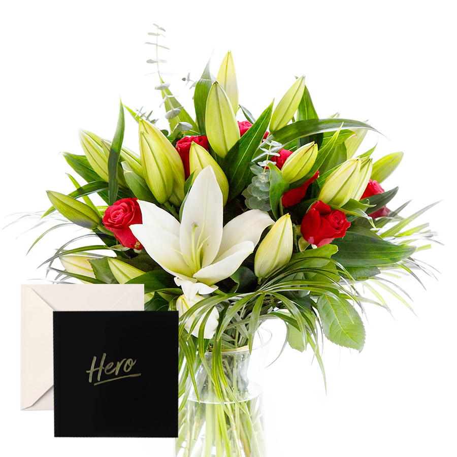 Show your love with our stunning bouquet featuring passionate red roses and elegant white lilies, perfect for Valentine’s Day gifting.