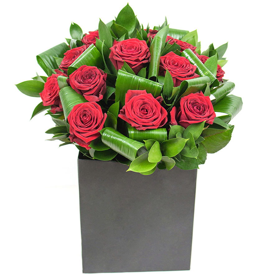 Immerse yourself in the refined beauty of our opulent bouquet featuring bold red roses harmonized with lush aspidistra leaves and tender ruscus accents. Perfect for adding a striking centerpiece to your home or expressing heartfelt sentiments.