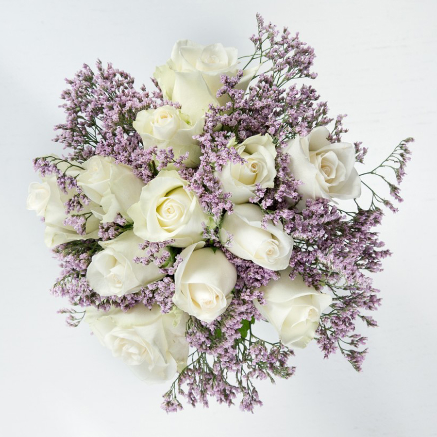 Timeless white roses with no doubt could say it all. Soft to perfection and gently arranged with pale purple limonium this bouquet will express your deep sorrow in the most gentle way possible.